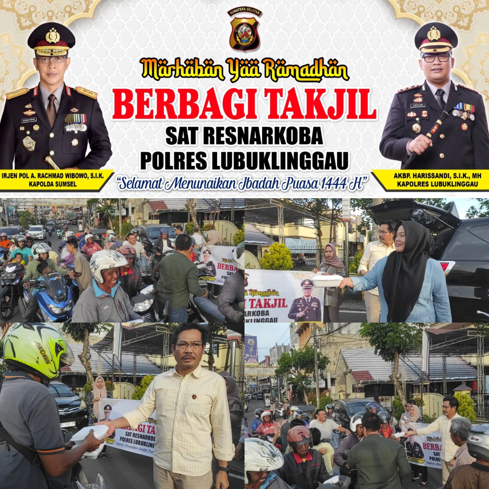 Kapolres Lubuklinggau AKBP Harissandi melalui Kasat Narkoba Polres Lubuklinggau Polda Sumsel AKP Hendrawan mengungkapkan, Kegiatan pembagian Takjil sebagai wujud kepedulian sosial Sat Resnarkoba Polres Lubuklinggau kepada masyarakat di bulan Ramadhan 1444 H/2023 M di kota Lubuklinggau.